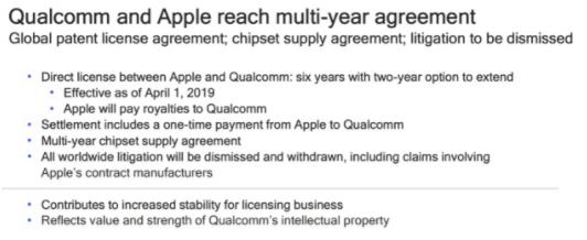 但在4月17日淩晨,蘋果和高通公司在各自官網同時宣布,雙方同意在全球放棄所有訴訟,並簽署至少六年的專利許可協議,和解協議中包含的一項重要內容是蘋果支付給高通一筆專利款項,高通將為蘋果供應芯片組,據悉,蘋果已開始試使用高通的5G通信半導體,並要求多家供應商試用,蘋果與高通為期兩年的專利大戰終於告一段落。